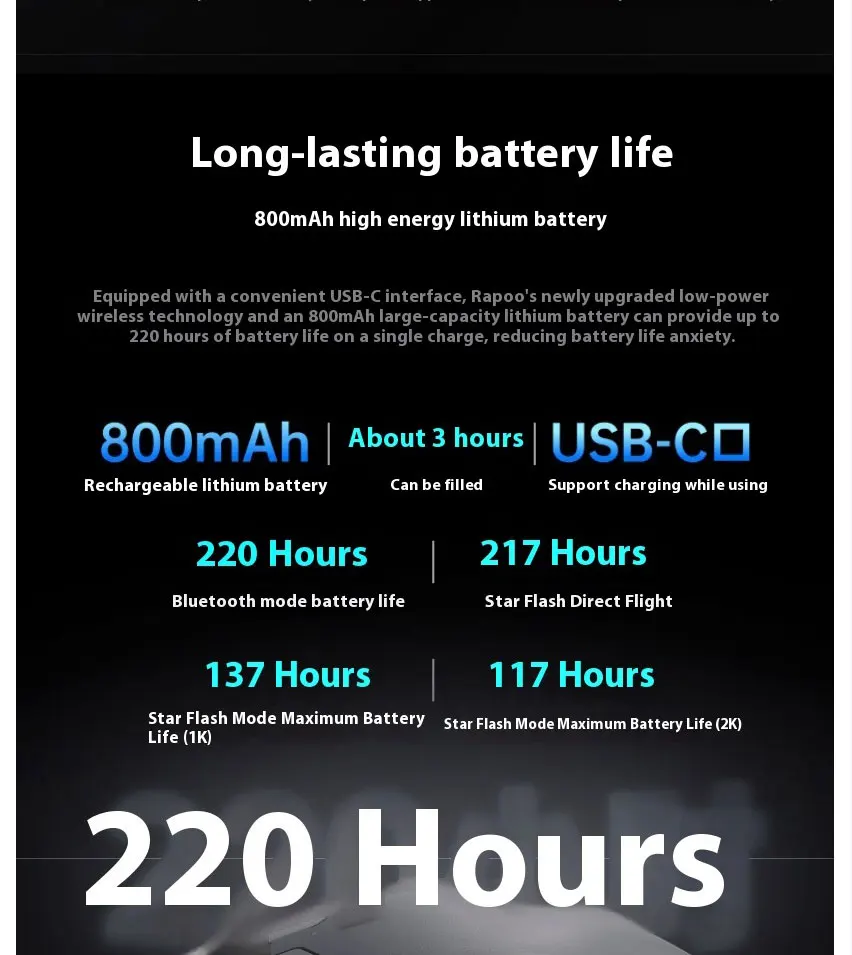 Full-battery Bluetooth mode lasts approximately 220 hours | Full-battery Star Flash direct mode lasts approximately 217 hours