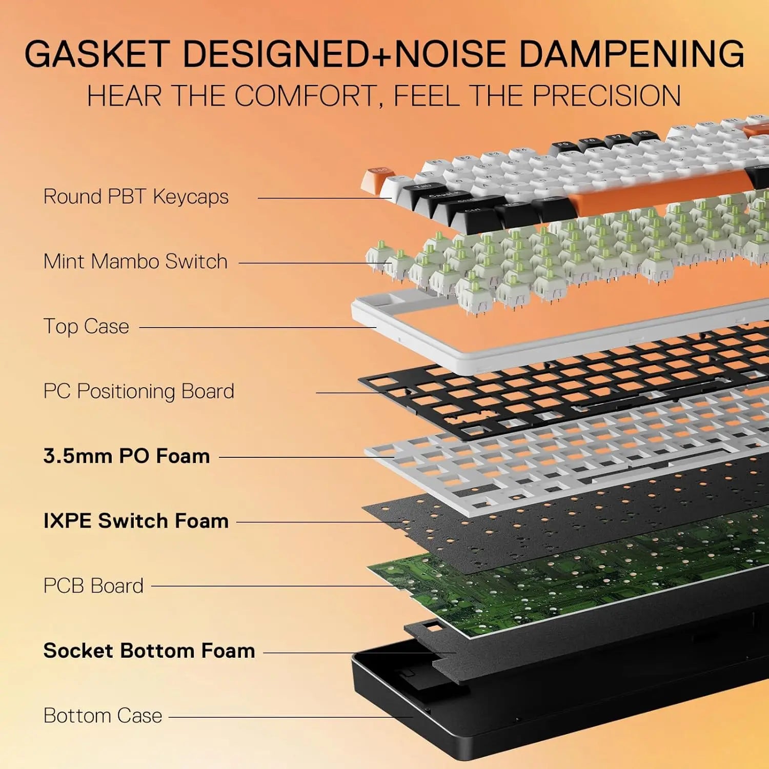 Noise Dampening x 3 - Equipped with 3.5mm PO foam, IXPE switch foam, bottom socket foam, along with the silicone gasket. Significantly reduce the hollow noise, creating dampened and ultra-clean typing acoustics, making each keystroke satisfying and comfortable.